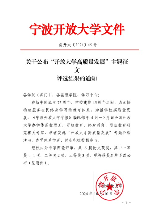 近日,由《宁波开放大学学报》编辑部组织开展的“开放大学高质量发展”专题征稿活动评选结果出炉。我校远程学习支持服务中心教师闫坤豪提交的论文《大数据时代下开放教育线上线下教学路径研究》荣获三等奖。