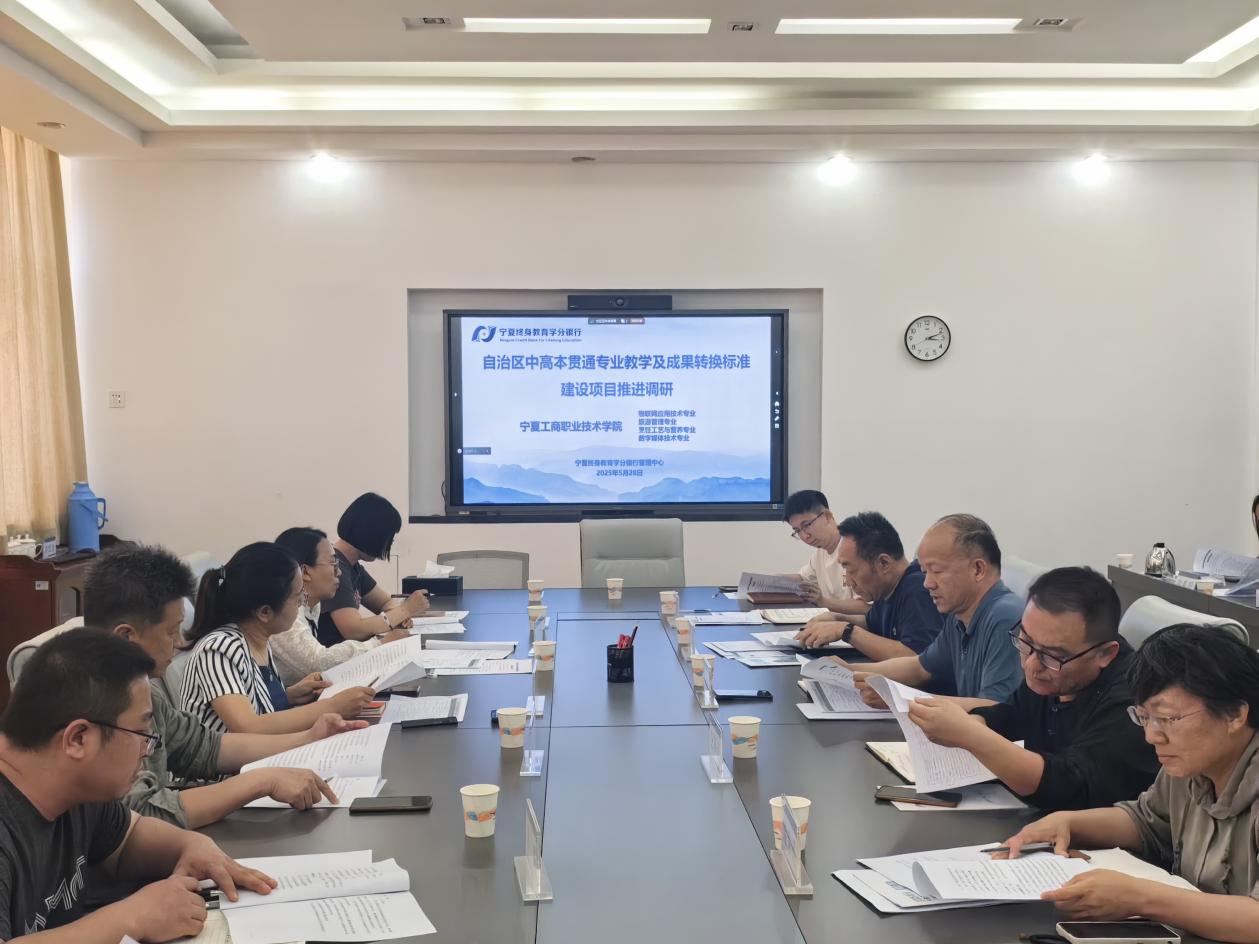 2025年5月28日下午,宁夏终身教育学分银行管理中心主任杨晓燕率队赴宁夏工商职业技术学院,就自治区中高本贯通专业教学及成果转换标准建设项目推进情况开展专题调研。本次调研会以座谈会形式开展,宁夏工商职业技术学院教务处处长罗彦祥主持会议,来自全区七所中职、本科合作院校代表及项目团队成员共30余人参会,部分院校代表通过线上方式参与。