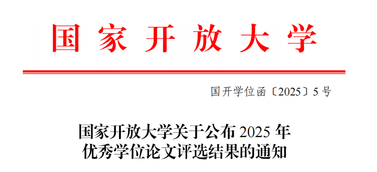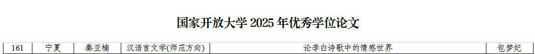 近日,国家开放大学公布2025年度优秀学位论文评选结果,开放教育汉语言文学专业学生秦亚楠的论文《论李白诗歌中的情感世界》成功入选全国172篇优秀论文之一,指导教师为我校教师包梦妃。