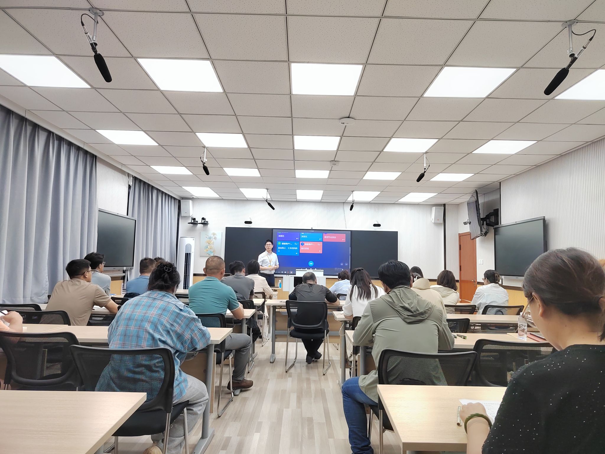 当晚18时50分,线下参会人员完成智慧教室现场签到,通过系统关联实现听课记录数字化管理;18时55分,线上参与者扫描专属二维码进入课堂平台,在统一信息登记表中完成身份核验。19时整,工业工程学院占世源老师依托智慧教室直播系统,开启《高层建筑施工》重难点章节的期末辅导。课堂上,他以PPT课件结合实际施工作业案例,为学生串讲该课程的重难点内容,引导学生围绕课程期末考试重点展开讨论。
