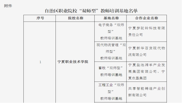 近日,自治区教育厅公布了职业院校“双师型”教师培训基地评选结果,共评选出11所院校17个专业和28家企业为自治区级职业院校“双师型”教师培训基地,将承担我区专业技能培训任务。我校与宁夏梦驼铃科技有限责任公司共建的电子商务“双师型”教师培训基地,与宁夏新华百货现代物流共建的现代物流管理“双师型”教师培训基地,与宁夏盐池滩羊产业发展集团有限公司、宁夏农垦集团共建的畜牧“双师型”教师培训基地,与共享智能铸造产业创新有限公司共建的工程工业“双师型”教师培训基地成功获批。