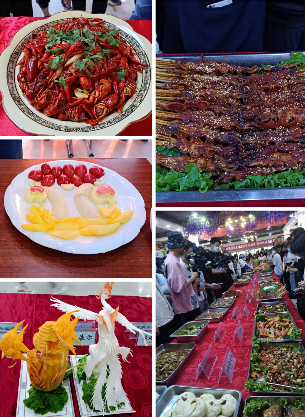 本次美食文化节共设置两个区域,室内区域由部分学生与食堂工作人员共同制作热菜菜品与冷食餐品进行比拼,制作完成后集中在食堂中心位置展示,由评委评出优胜,免费供师生品尝。学校团委社团组织同学们进行了才艺展示,并开展了食品安全知识有奖问答。