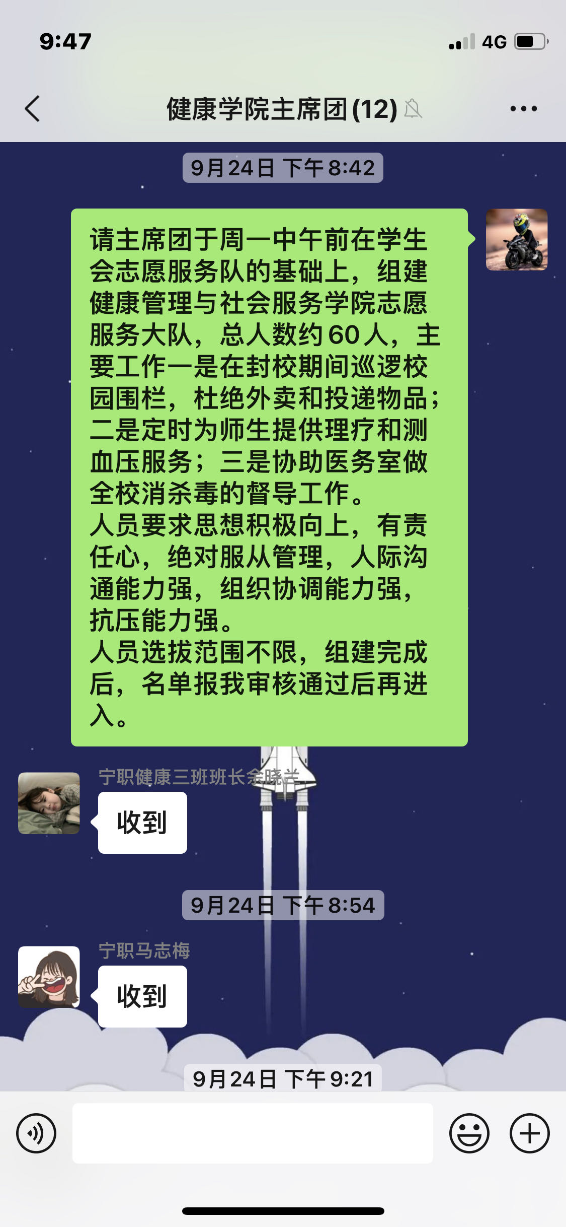 校团委坚决贯彻落实学校党委部署安排,坚持发挥支部战斗堡垒作用和党员先锋模范作用,第一时间学习传达各级党委政府、教育系统决策部署和学校党委工作要求,充分认识当前疫情防控形势,不断提高政治站位、坚定政治自觉,带头冲在疫情防控一线,统筹好、组织好、协调好青年志愿服务工作,在急难险重任务中作表率、当先锋。校团委于9月21日迅速组织集结“团员青年突击队”,调整优化校园常态化疫情防控志愿服务方案,先后在“青春宁职NXTC“官微发布《@宁职团团,致全校广大团员青年的疫情防控倡议书》《拒绝外卖、拒绝网购,从我做起》,倡议各级团组织听从学校党委号召,坚决扛起疫情防控政治责任,积极主动作为、敢于担当,切实发挥各级团组织引领凝聚青年的作用。