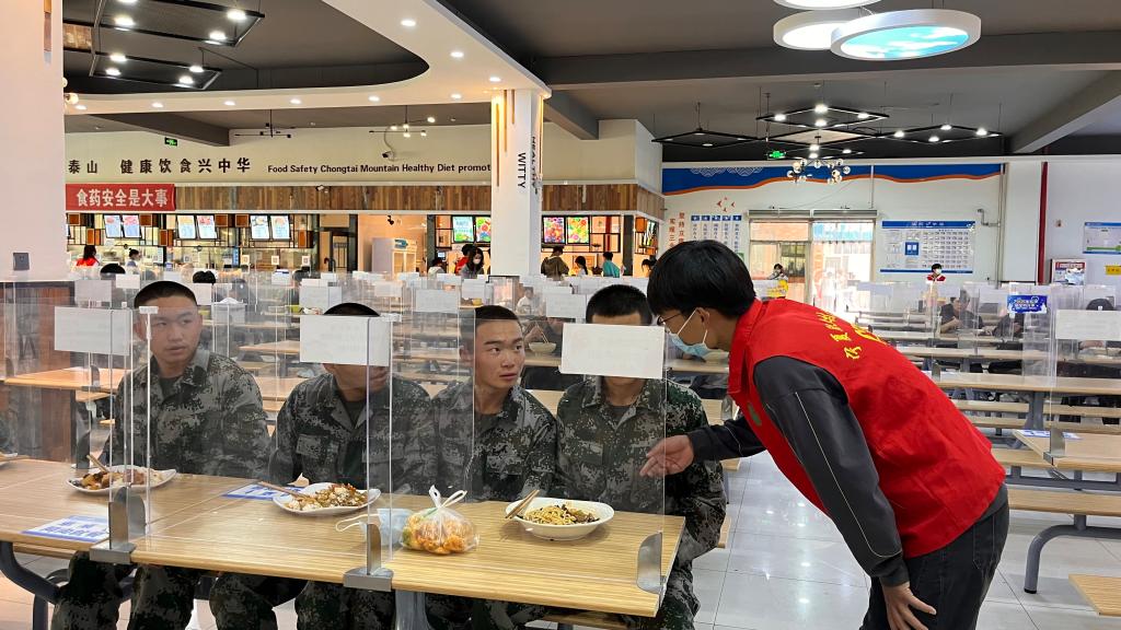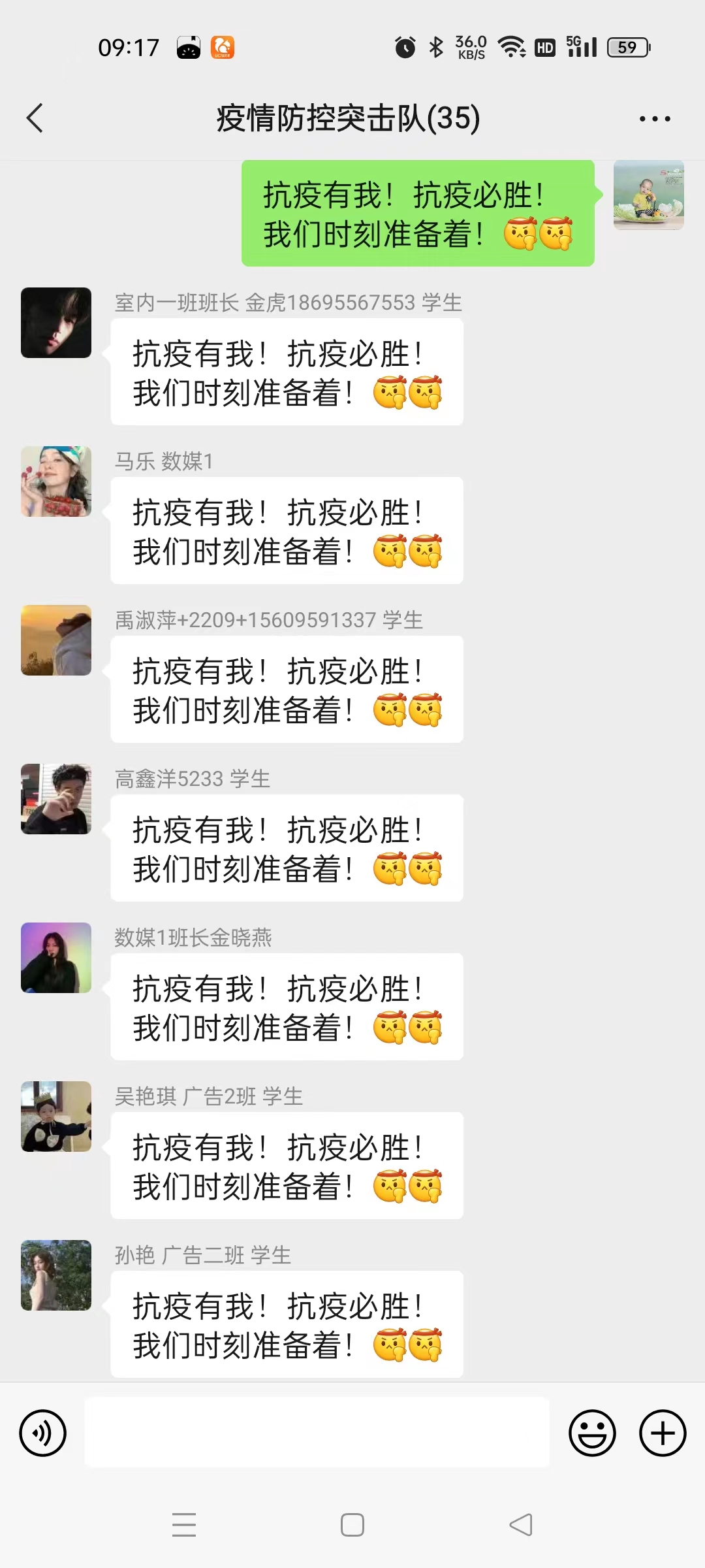 越是关键时刻,越能凸显共青团紧跟党走的坚定信念和坚强决心。各级团干部坚持走在前作表率,带动身边师生群众和家庭成员坚决落实疫情防控个人主体责任,当好自身健康第一责任人。疫情就是命令,防控就是责任。在校团委的指导下,在校的6名教工团支部教师团员积极投身于校园疫情防控工作中,带领百余名学生志愿者开展餐厅文明引导、教学楼清洁消杀、校园巡逻等工作,并深入各班以防疫知识宣传、与学生谈心谈话等方式助力校园疫情防控,做好学生管理和情绪疏导,确保防疫工作顺利进行。“别担心、有我在”“我是团员、我先来”,志愿者们坚持“有一份热、发一份光”,用实际行动践行志愿服务精神,以志愿之力守护校园安全,在战疫征程上响彻“请党放心、强国有我”的青春誓言。