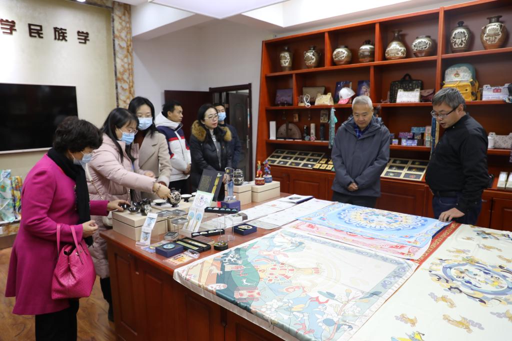 在西夏学研究院,一行人参观了宁夏大学根植本土风土人情,发掘地域文化特色设计推出的一系列文创产品,了解其设计缘起、创作构思、运营及销售情况。